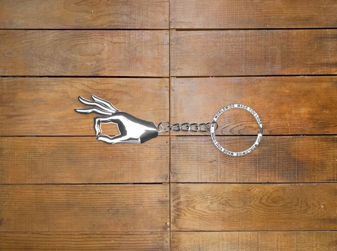 Constructed of solid metal, the Made You Look Key Chain features a ‘circle game’ OK hand-sign charm attached to an engraved flat ring to keep your keys secure. Made you look—if you know, you know.