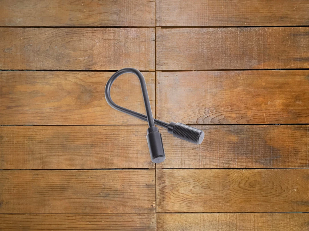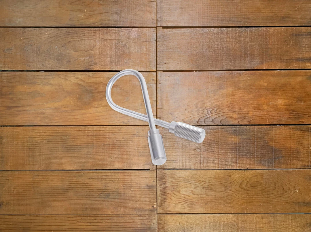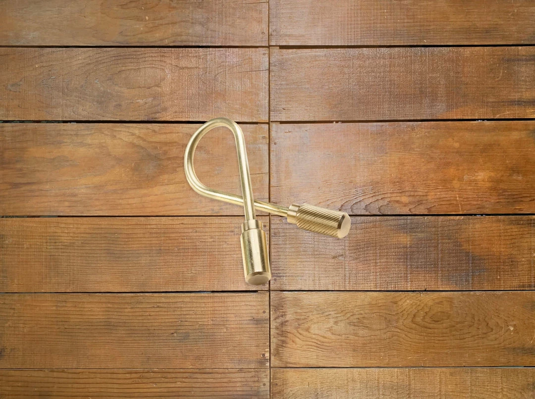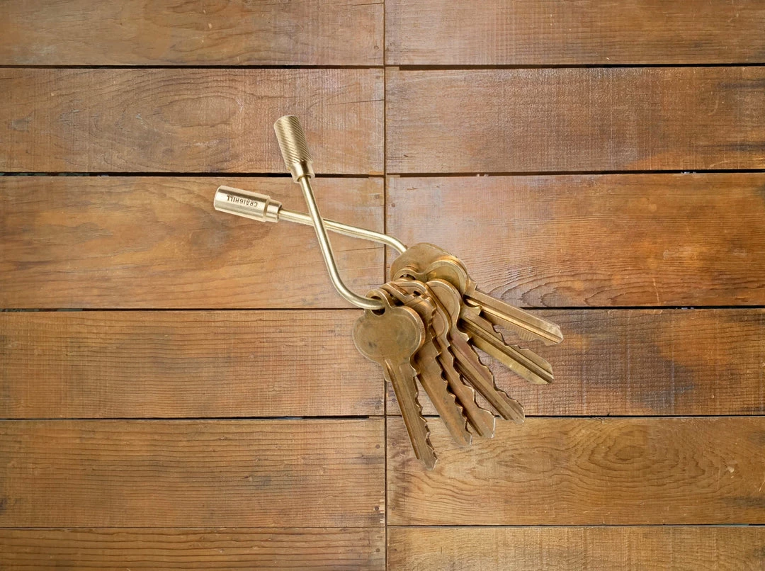 A helix-shaped brass wire with turned end-caps. Simply unscrew the knurled side to add or remove keys. A daily, tiny joy.