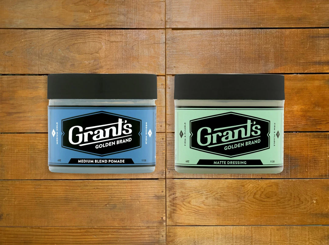 Grants Golden Brand prime water based pomades offering long-lasting hold, appealing scents, and wash off easily so you don’t deal with annoying wax buildup, unnecessary hair pulling, or wax residue stains on pillows.