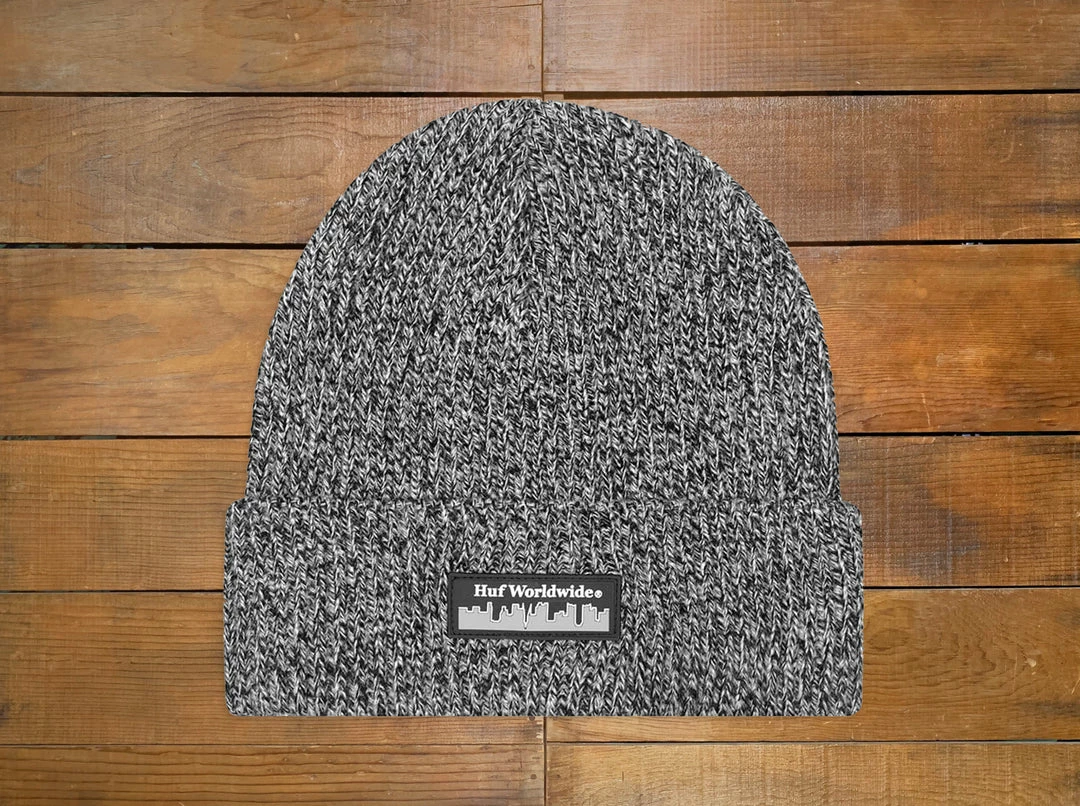 An homage to HUF’s metropolitan roots, the Boroughs Beanie is constructed from marled yarn in a classic dome shape with a fold-over cuff and features a rubberized city skyline patch at the front.
