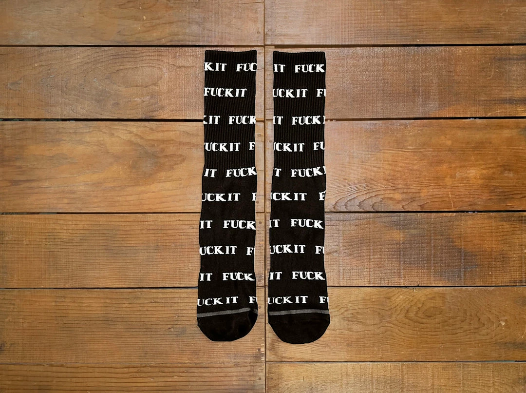 The Fuck It Sock features HUF’s signature ‘Fuck It’ slogan in an all-over print on a solid body. Downhill from here.