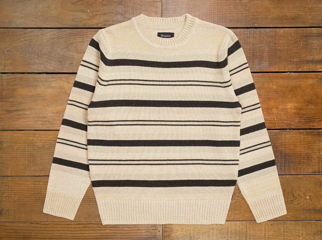 The Brixton Wes Sweater is a 7-gauge 280-gram acrylic/wool knit sweater featuring a knit stripe pattern and a flag label at side seam.